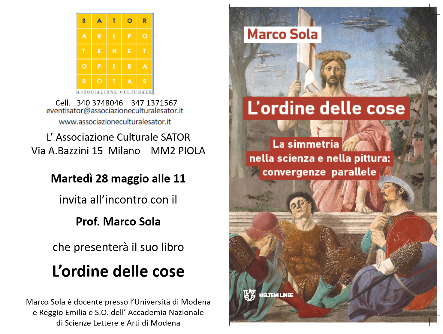 Martedì 28 maggio alle 11.00 vi aspettiamo in SATOR per l’incontro con Marco Sola. Alleghiamo la locandina con la foto della copertina del libro che ci presenterà proiettando, certamente senza aridi “tecnicismi”, molte immagini di affascinanti opere d’arte.